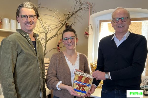 Bürgermeister Bernhard Lindner (rechts) gratuliert Carolin Dietrich und überreicht das Hahnbacher Marktwappen