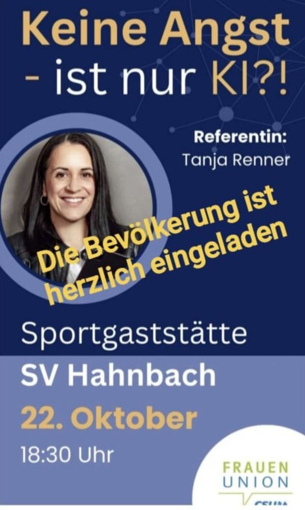 FU Hahnbach - Vortrag "Keine Angst ist nur KI"?!, Mittwoch, 22. Oktober 2025 Geschrieben von ehö am 07. Oktober 2025. Veröffentlicht in Nachrichten zu Hahnbach. Die Frauenunion Hahnbach lädt ein zum Vortrag "Keine Angst ist nur KI?!" mit der Referentin Tanja Renner Bitte weitersagen, DANKE!!! Aufrufe: 189 Drucken Zurück Weiter
