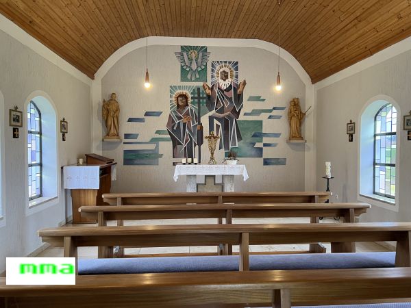 Die Kapelle ist der Heiligen Dreifaltigkeit gewidmet, wie das große Altarbild des Künstlers Hans Kreiner aus Mantel zeigt