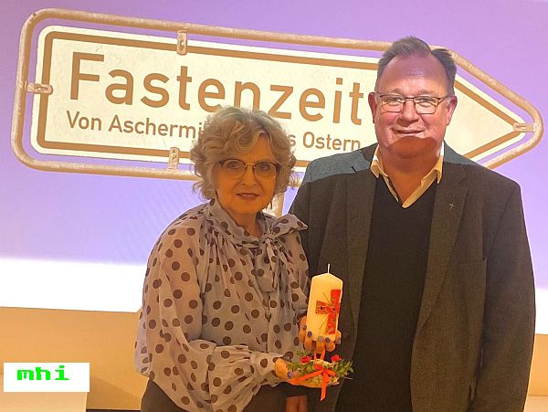 Für den besinnlichen, mit vielen wertvollen Impulsen gestalteten Abend bedankte sich Hildegard Gallitzendörfer bei Pfarrer Birner mit einer selbstgestalten Osterkerze und einem besonderen Kränzchen für den Palmsonntag