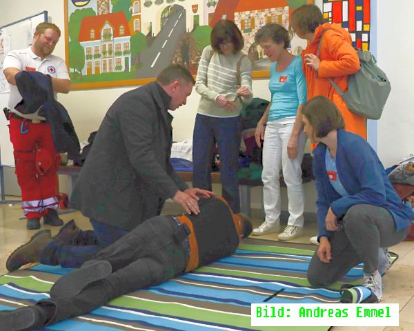 Dabei wurde besonders auf die wichtigsten Schritte eingegangen: Das Absetzen des Notrufs, die Überprüfung von Bewusstsein und Atmung sowie die Durchführung der Herzdruckmassage. Auch der Einsatz eines Defibrillators wurde anschaulich erklärt.