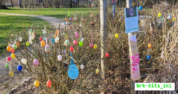 Auf dem Weg vom Kindergarten bis hin zur Gockelwiese erstrahlen seit dem Palm-Wochenende viele Büsche und Sträucher in einer bunten Osterpracht.
