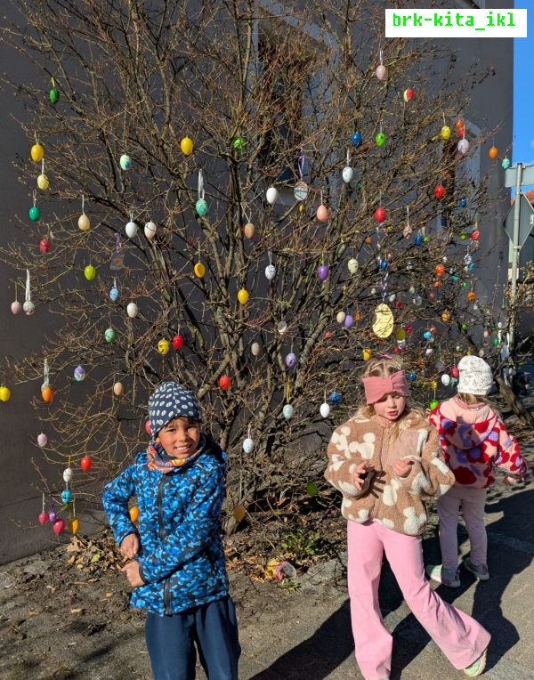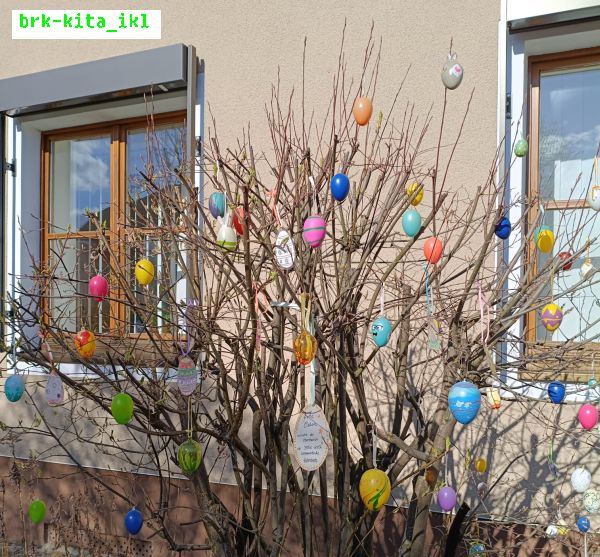 Mit viel Liebe wurden zahlreiche bunte selbst bemalte und beklebte Eier aufgehängt – darunter auch viele laminierte Papiereier, die in den vergangenen Jahren im Kindergarten gesammelt wurden. Ergänzt wird dieser fröhliche Schmuck durch einige niedliche, bemalte Holzhäschen, die zwischen den Zweigen hervorlugen.