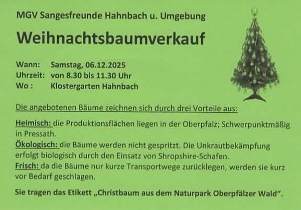 Aufgrund der großen Nachfrage in den Vorjahren und den positiven Rückmeldungen organisiert der Männergesangverein Hahnbach wieder einen Weihnachtsbaumverkauf.