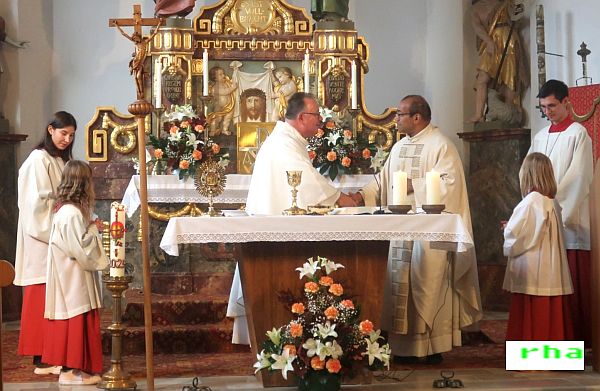 Beim Seniorengottesdienst sprechen sich Pfarrer Michael Birner und Pater Jimmy Joseph den Friedensgruß zu