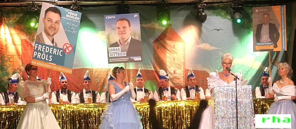 „Spieglein, Spieglein in der Hand, wer wird wohl Bürgermeister im Vilsecker Land?“ So fragte HKV-Vorsitzende Barbara Schneider als Schneewittchen (am Rednerpult) und deutete auf die schönsten Männer im Wahlkampf hin, deren Konterfeis auf der Bühne gezeigt wurden