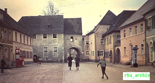 Das Bild zeigt die Vorstadt und das Hafnertor Ende der 1940er Jahre. Der Durchgang am Piehler-Haus war noch nicht vorhanden. Die beiden Tankstellen bei Café Högl und Seegerer gehören längst der Vergangenheit an